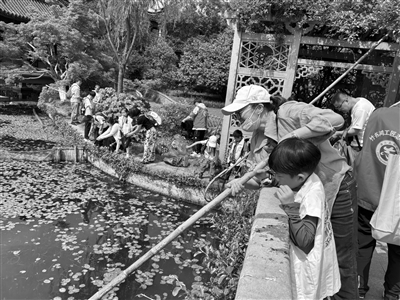 上周日,商报小记者实践营邀请了十余名商报小记者来到花港公园,当一回“河道美容师”,跟着护河队一起,身体力行,为杭城做一次公益服务。活动现场,小记者们或是肩扛打捞兜,或是手持垃圾钳,清理河道,干得热火朝天!