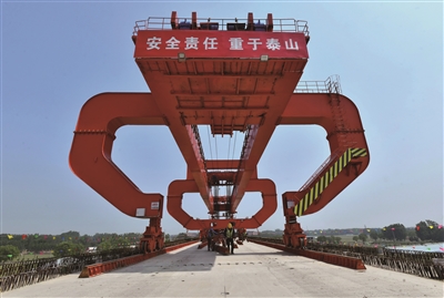 5月23日,中铁十九局的工人在雄商高铁河北段肃宁东站前三标段进行架梁作业。目前,国家重点工程雄(安)商(丘)高铁河北段建设正在按照建设节点要求稳步推进。雄商高铁是京港(台)通道的重要组成部分,正线全长552公里,设计时速350公里。