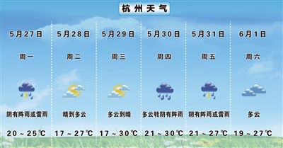 今天开始到6月初,北方冷空气活跃,同时降雨会明显多起来。随着“雨水君”的重新上岗,杭州气温会明显回落,最高气温很难超过30℃。