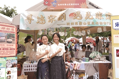 在萧山区高桥初中的摊位前,四名学生统一穿着马面裙,正在售卖漆扇、香牌与香球,以及橘红糕。小摊主俞越说,自家摊位售卖的商品都与传统文化有关,其中漆扇是中国的非物质文化遗产。