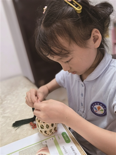 我和妈妈决定一起香囊DIY。我们先拿出绿油油的艾草放进圆圆的小灯笼里,再将写好祝福的卡片穿入五彩绳,然后把五彩绳的两端分别穿入小灯笼两侧,最后把精美的流苏穿入小灯笼底部,就这样,一个玲珑可爱的小灯笼香囊就做好了。