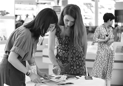 6月19日,在北京展区,海豚出版社的工作人员与来自俄罗斯的客人商洽图书版权。