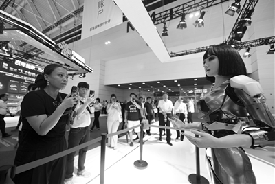 参观者在博览会上和一款仿生机器人互动