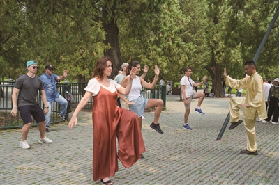 7月9日,几名来自意大利的游客在北京天坛公园体验练习太极拳。在“72/144小时过境免签”等系列便利外籍人士来华的政策推动下,外籍人士中国行持续升温。国家移民管理局7月5日通报,今年上半年全国各口岸入境外国人1463.5万人次,同比增长152.7%。其中,通过免签入境854.2万人次,同比增长190.1%。