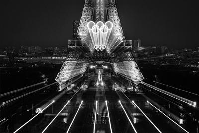 7月14日是法国国庆节。奥运元素在国庆节光影焰火秀中精彩亮相。