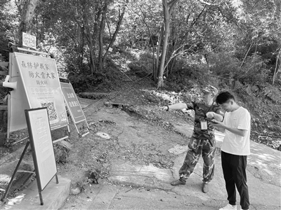 “各位游客,上山前请先扫描防火码,自觉登记……”“进入林区、防火第一。”“师傅,香烟灭灭掉。”……