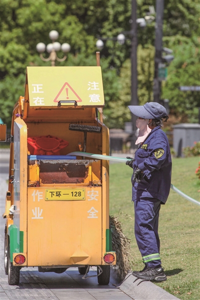 武林广场附近,一位环卫工人正在给自己的小车补水,准备前往下一区域进行清洁作业
