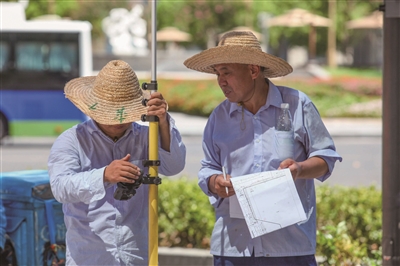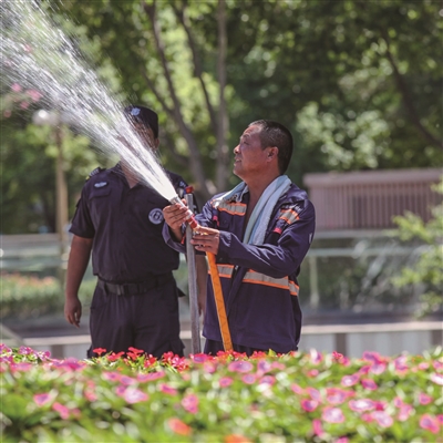 园艺工作人员正在武林广场的花坛旁给花草降“温”