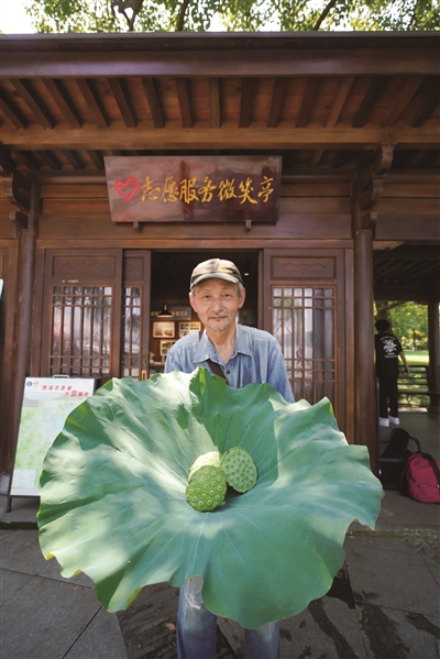 昨天早上,2024年西湖莲蓬荷叶在柳浪闻莺微笑亭开始义卖,首日70份套餐仅十几分钟便售罄。 今年义卖延续线下售卖的传统,新鲜出炉的“爱心莲莲”西湖荷香套餐,以3个莲蓬和5张荷叶为一组,每份售价10元。套餐的售卖时间为每个工作日的8点30分至9点之间,市民可凭当日号码牌购买,每人限购1份,售完为止(遇雨天、双休日停售)。义卖活动将持续至8月下旬。图为昨天,一位市民与在售的“爱心莲莲”西湖荷香套餐合影留念。 商报记者 项凯 摄影报道