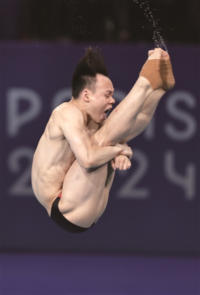 8月8日,在巴黎奥运会跳水项目男子3米板决赛中,中国选手谢思埸获得金牌,另一名中国选手王宗源获得银牌。这是中国选手谢思埸在比赛中。