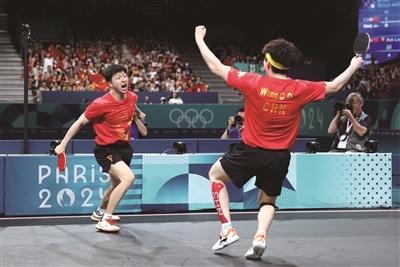8月9日,在巴黎奥运会乒乓球男团金牌赛中,中国队3∶0战胜瑞典队,获得冠军。这是中国队组合马龙(左)/王楚钦庆祝胜利。