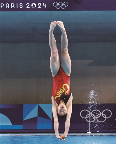 8月9日,在巴黎奥运会跳水项目女子3米板决赛中,中国选手陈艺文获得金牌,另一名中国选手昌雅妮获得铜牌。这是陈艺文在比赛中。