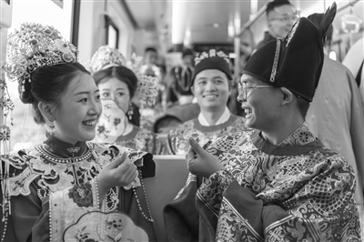 新人参加由浙江省金华市民政局与金华市轨道交通集团有限公司联合举办的“缘起金轨、爱在七夕”集体婚礼