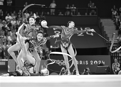 8月10日,中国队在比赛中。 当日,在巴黎奥运会艺术体操项目集体全能决赛中,中国队获得冠军。