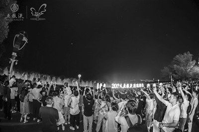 随后,身着马面裙、旗袍等中华传统服饰的77对情侣,与现场七千多名挥动发光玫瑰的市民游客一同观赏了音乐喷泉表演。