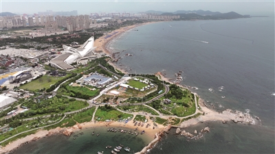 岸线 修复 这是8月14日拍摄的山东青岛西海岸新区蓝湾漫道金沙滩段(无人机照片)。山东省近年来持续开展海洋生态修复、蓝色海湾整治行动等工作,整治修复滨海湿地4675公顷。通过修复整治生态岸线项目,还城市一条“蓝腰带”;配套建设城市书房、海洋美学馆等文化设施,还市民亲海、休闲空间,让海滨城市飘扬起生态“绿丝带”。