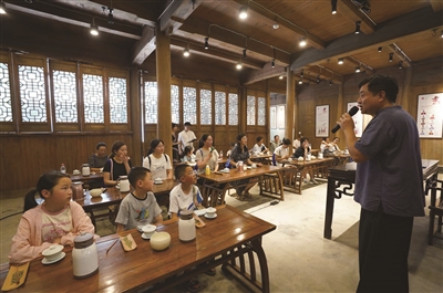 清茶一盏亦能醉人。中国的饮茶之风,兴盛于宋朝,宋式点茶中更是蕴含着流传千年的风雅气韵。从温盏、投茶粉,到注汤调膏、注汤击拂,茶艺师的一举一动都吸引着大家的目光。现场的孩子们也都跃跃欲试,纷纷模仿着茶艺师的动作,感受宋式点茶中的无穷魅力。