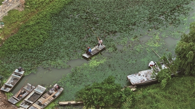 8月27日,村民在江苏省淮安市洪泽区老子山镇龟山村采摘菱角(无人机照片)。“千年龟山里,淮上第一村。”洪泽区老子山镇有一座因山得名的小村庄,其形若巨龟浮于水面,因此得名龟山村。整个村落三面临水,一面接陆,由东向西依次呈现湿地、村落、山体、河流的山水格局,山环水绕,生态优美。村内现留存“龟山遗址”“淮渎庙”等各级文保单位6处,2014年入选第三批中国传统村落名录。