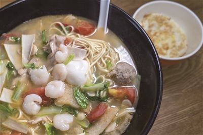 大碗面的三鲜面上桌。一碗面里,鱼圆、肉丸、发皮、肚片、番茄、笋片、蘑菇……什么都有。三鲜面,既然是汤面,那肯定要先喝汤,一口汤进嘴里,咸鲜、柔和,直想喝第二口。