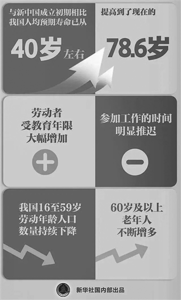 与新中国成立初期相比,我国人均预期寿命已从40岁左右提高到了现在的78.6岁,同时劳动者受教育年限大幅增加,参加工作的时间明显推迟。另一方面,我国16至59岁劳动年龄人口数量持续下降,60岁及以上老年人却不断增多。