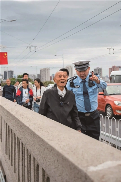 ③75岁的老兵陈有银在当地警察的陪同下登上武汉长江大桥参观。据央视军事微信公众号
