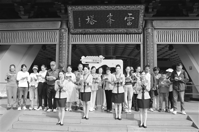 金秋佳节,兰桂飘香,雷峰塔景区在重阳节当天开展“重阳家风韵:共影绘忆、登高祈福”重阳登高活动。游客带着父母来雷峰塔诵读家训、登高祈福,景区工作人员还会拍下照片并打印出来,为游客定格阖家美好的瞬间,给这次重阳之旅留下特别的回忆。图为工作人员和游客一起在雷峰塔下诵读家训。 商报记者 朱荣