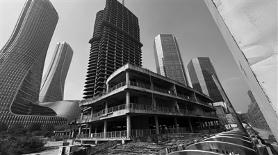 上周六上午10时许,记者来到杭州国际中心工地现场。站在江锦路和民心路的交汇口可以看到,一幢约40层楼、高度近190米的塔楼拔地而起,裸露的灰色外立面在周围一众摩天大厦中显得格外暗淡,楼顶的吊机静置在半空;旁边的裙房仅有三四层楼。目前,塔楼未见持续“长高”的动静。