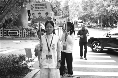 活动分为上下午两场,每场的孩子们都分组协作完成劝导任务。比如有的手举“文明出行”指示牌,有的负责大喊提醒行人等。在实地劝导之前,在商报记者的带领下,孩子们学习了《杭州市文明行为促进条例》,特别是第九条提到的——行人应当在人行道内行走,通过路口或者横过道路时,应当走人行横道或者过街设施,按照交通信号灯指示通行,不跨越、倚坐道路隔离设施,不浏览手持电子设备,快速通过不停留不嬉闹。这是孩子们当天重点劝导任务。