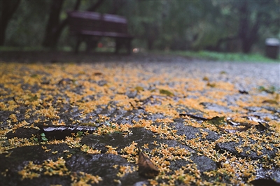 昨天,随着又一股冷空气的到来,杭州大雨如注,使正值盛花期的桂树花落如雨,遍地花瓣,别具韵味。接下去还有大风降雨的天气,桂花可能会提前凋谢,大家抓紧时间观赏。图为昨天,杭州植物园桂花紫薇园内,缀满枝头的桂花被风雨打落满地。商报记者 项凯 摄影报道