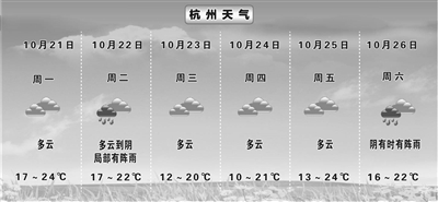 浙江天气预计,新一股冷空气在22日(周二)前后开始影响,由此将出现降温、弱降雨和北风增大。在这股冷空气的影响下,最高气温不会出现明显的下降,但是最低气温和这两天相比会再下一个台阶,大部分地区最低气温将创入秋以来新低。具体到杭州,尤其周三至周五的早上,最低气温仅有10℃至13℃。
