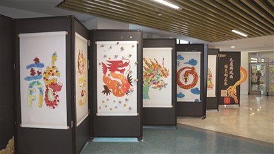 在杭州市春晖小学大厅,陈列着学生们用废弃物品制作的以龙为主要图样的美术作品。