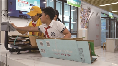 在杭州市春晖小学的晖宝红领巾服务公司,学生们正在对纸板等回收物品进行称重。