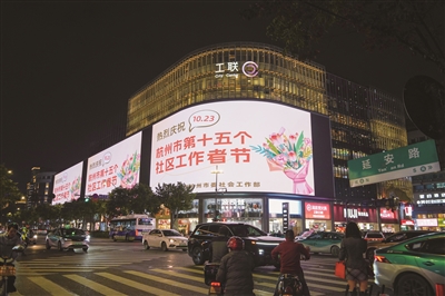 今天是杭州市第十五个社区工作者节。10月22日-24日,全市200余块三联大屏全天滚动播放“社区工作者节”公益宣传海报,钱江新城也将开启主题灯光秀,致敬社区工作者!图为昨晚延安路工联CC户外大屏播放的“社区工作者节”公益宣传海报。