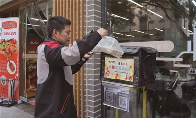 近日,一份来自弄杭里邻里食堂的10元友好套餐,在“小哥”圈引发共鸣。这家位于上城区闸弄口社区的弄杭里邻里食堂门口放了一个保温箱,箱上贴着“小哥友好取餐点”的标识。箱子里放着打包好的10元套餐,“小哥”们路过就可以即买即取,非常方便。小哥取餐专区每天中午11点左右开始供应,每份10元餐包含一荤两素,专为新就业群体服务。图为昨日,一位小哥在取餐点取餐。 商报记者 刘卓黎 摄影报道