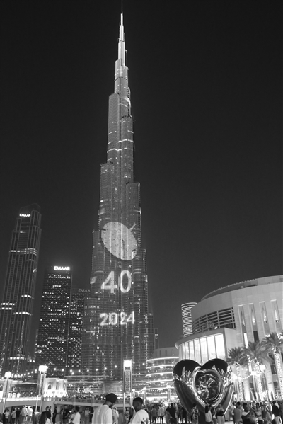 这是11月1日在阿联酋迪拜拍摄的上演灯光秀的哈利法塔。 当日,阿联酋迪拜哈利法塔上演灯光秀,以“友谊四十载 未来更可期”为主题,展示中国与阿联酋建交40年来在科技、航天、文化、旅游等领域的友好合作。
