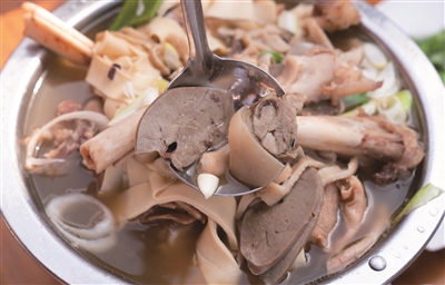 掏羊锅的灵魂就是羊肉和老汤,这两样可得好好讲究。羊肉挑的是1到2年、15到25公斤的山羊,这样的肉煮出来又紧实又没膻味,再来点羊杂碎,这一锅的味道立马丰富起来。