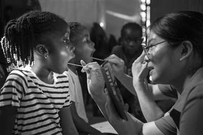 11月20日,在纳米比亚首都温得和克附近的弗兰斯艺术培训中心,中国医生给孩子们进行口腔健康检查。 当天是世界儿童日,第十六批中国援纳医疗队的四名队员一早就来到了距离首都温得和克20多公里的弗兰斯艺术培训中心,为在此就读的45名生活在贫民区的孩子进行身体和口腔健康检查,并给孩子们准备了学习用品、绘画工具和食品。
