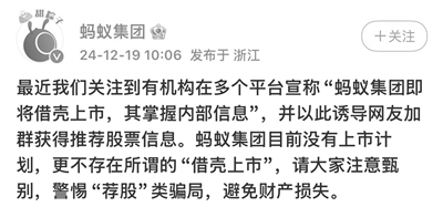 12月19日上午,蚂蚁集团在官方微博发文中称:蚂蚁集团目前没有上市计划,更不存在所谓的“借壳上市”,请大家注意甄别,警惕“荐股”类骗局,避免财产损失。