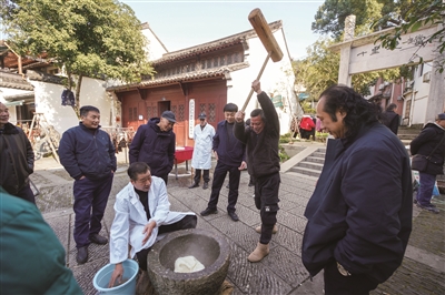 昨日,梅家坞村,村民在现场演示传统的打年糕技艺。冬至前一天,杭州西湖景区梅家坞村开启了为期15天的晒冬活动。现场设置了晒酱货、打年糕等各色民俗活动,还设有晒冬祈福区、特色年货美食市集等,年味十足,吸引了众多市民游客参观体验。