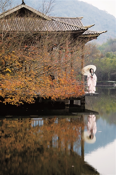 近日,一波接着一波的冷空气侵袭杭州。而在花港观鱼公园,枫叶依旧绚烂,为杭州留下一抹“秋意”。图为昨日,一位身着汉服的市民在花港观鱼公园的枫树下打卡拍照。商报记者 严嘉俊 摄影报道