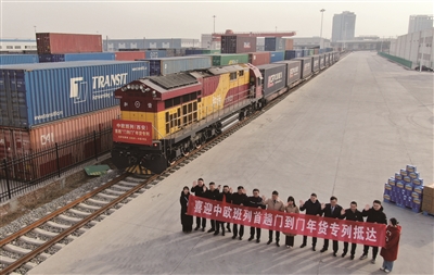 1月10日,满载着1300吨哈萨克斯坦成品面粉的中欧班列通过西安国际港站专用线驶入西安爱菊粮油工业集团加工园区,标志着首趟中欧班列(西安)“门到门”年货专列顺利抵达西安。此次开行的“门到门”专列,由哈萨克斯坦北哈州爱菊粮油海外厂区铁路专用线始发,抵达西安国际港站后,通过铁路专用线直接开入西安浐灞国际港爱菊农产品物流加工园区,降低了企业运输成本。这是首趟“门到门”年货专列开抵爱菊农产品物流加工园区(无人机照片)。
