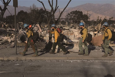 1月10日,在美国加利福尼亚州洛杉矶县阿尔塔迪纳地区,消防员在山火过火区域巡查。 美国洛杉矶地方官员10日说,该地区持续山火已造成至少11人死亡,超过1.2万栋建筑物损毁。目前仍有多处山火蔓延,其中规模最大的伊顿和帕利塞兹两处大火仍在东西两侧肆虐洛杉矶县。