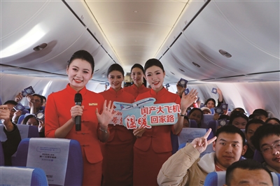 1月14日,在南航CZ8233广州—成都天府航班上,空乘人员开展C919国产大飞机投入春运主题活动。当日是2025年春运第一天,中国南方航空3架C919国产大飞机全部投入春运,执行广州往返杭州、上海虹桥、海口、成都天府4条航线的10个航班。