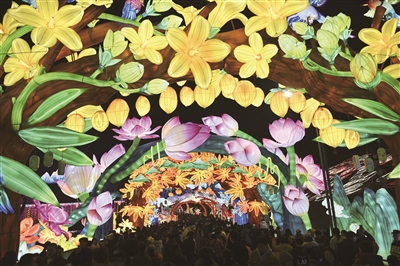 1月15日晚,第31届自贡国际恐龙灯会在四川省自贡市中华彩灯大世界亮灯试展。本届灯会分“迎春贺年”“华彩神州”“欢乐盛典”“文明交辉”等七大主题区,共制作12组特大型灯组、7组大型灯组与200余组中小型灯组,吸引游客前来赏灯游园。这是游客在自贡灯会上游览。
