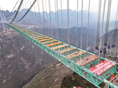 1月17日,在建世界第一高桥——贵州六安高速公路花江峡谷大桥成功合龙,为今年通车运营打下坚实基础。项目资料显示,大桥为钢桁梁悬索桥,全长2890米,其中主桥跨径1420米,桥面至水面高度625米。建成后,会成为新的世界第一高桥、世界第一的山区跨径桥梁。这是花江峡谷大桥(无人机照片)。