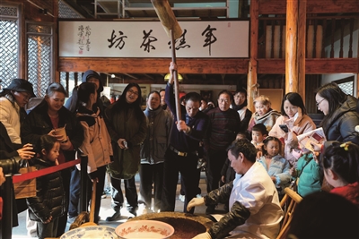 “嘿咻!嘿咻!”在一阵阵吆喝声中,一股年糕的糯香从画外桐坞年糕坊里缓缓飘出。走近一看,一位位年糕师傅正在里面忙活着,磨盘磨粉、蒸笼上灶、石臼捶打……在充满历史感的石臼中,刚出锅热气腾腾的大米被木槌一下下地捶打,打出来的年糕雪白如玉,米香氤氲,只需一口,就香糯到了心坎里。