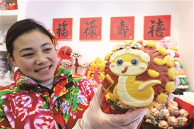 安徽省淮北市濉溪县一家花馍制作坊内,工人在展示制作的生肖蛇花馍。蛇年春节临近,各地赶制富有美好寓意的花馍供应市场,为佳节增添喜庆气氛。