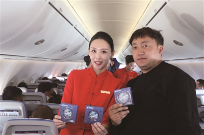 1月14日,斯郎伦珠在南航CZ8233航班上展示空姐为乘客赠送的C919徽章。斯郎伦珠是西藏昌都的一名小学老师,他和家人一行7人在广东旅游了几天,这天正准备坐飞机去成都。