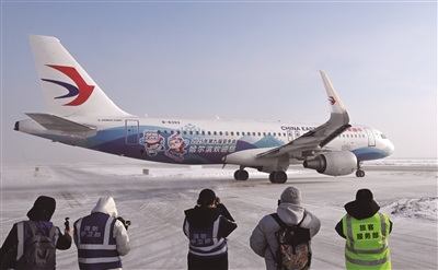 双跑道服务亚冬 1月23日,随着东航MU5616航班“亚冬号”主题彩绘飞机顺利起飞,哈尔滨国际机场二期扩建工程新建东二跑道正式投运。哈尔滨机场成为东北地区首个拥有双跑道的机场,将为亚冬会提供更好的抵离服务。这是“亚冬号”准备起飞。