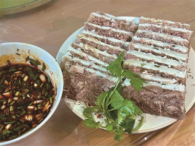 霍里羊糕用的是本地山羊,整个制作过程需20多个小时,历经羊肉炖煮、脱骨、冷却、压实熬汤、浇汤、自然冷却等步骤,传承百年的古法技艺,羊肉的鲜味被最大限度保留下来。成型的羊糕晶莹透亮,状如膏脂,肉质酥烂绵软,还混合着羊脂特有的香气,蘸上麻油、辣椒、香醋等调料,羊糕的口感层次更加丰富了,鲜而不腻,香而不膻。